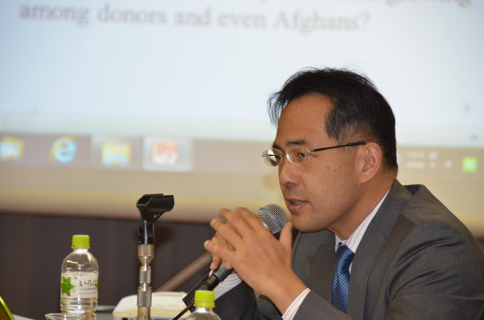 第二報告者の嶋田氏は、大統領選挙と治安権限がISAFからアフガニスタン政府に移譲される2014年はひとつの転換点になると位置づけた。不確実性があるなかでも、国際社会は10回の国際会議を開催し、アフガニスタンに支援を継続することを約束した。アフガニスタンは資金的援助を必要としているが、援助国からの資金は永久的に続けられるものではない。援助された資金を有効的に使用することが重要となる。嶋田氏は、国際社会が16兆$の支援を約束し、日本も向こう5年間に3兆$の援助を行う予定であることを説明した。さらに、JICAはアフガニスタンにおいて複数のプロジェクトを実施していることが紹介された。治安、統治、援助の有効な使用が、アフガン人と同国を支援する国際社会にとって重要となる。