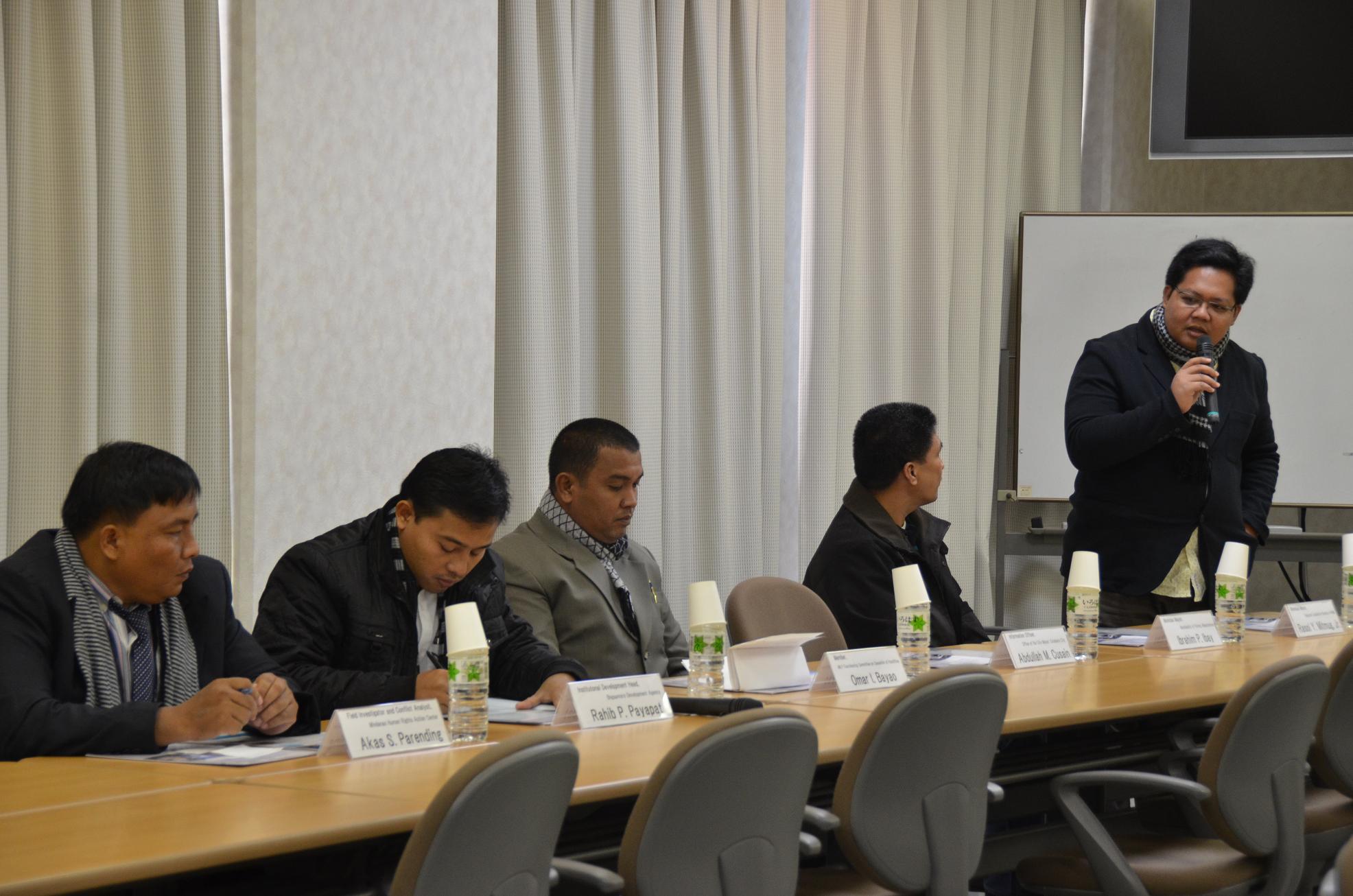 まず、司会者のリクエストに応じ、ミンダナオ代表団から参加者に対しミンダナオ紛争の背景について説明があった。ミンダナオの歴史を振り返りつつ、モロ・イスラムが外国との協定を結びながら、七つのイスラム王国を確立していたことが説明された。フィリピンにおいて近代国家が形成されるずっと前に、独自の政治的アイデンティティと国家を確立したにもかかわらず、バンサモロ民衆は歴史的に搾取されてきた。このことが、過去数十年におよぶ自由と民族自決、そしてアイデンティティの承認を求める武装闘争を生み出す要因となった。現在、フィリピン政府とモロ・イスラム解放戦線(MILF)との間の枠組合意により彼らの闘争は終わりに近づこうとしている。バンサBangsaとは国民を意味し、モロMoroとは南部フィリピンに暮らす人々を指す。枠組合意は、このバンサモロという独自のアイデンティティを承認した。それはつまり、この地域で暮らす人々がフィリピン人Filipinoとして一括りにされないことを意味する。討論では、和平プロセスにおける女性の役割、将来のバンサモロにおける統治のあり方、マイノリティと先住民の権利、ムスリムとキリスト教徒との関係、バンサモロ民衆の間の一体性など参加者から様々な質問があった。政府とMILFが包括的な和平合意へと至ることを望んでいることが代表団から示された。和平合意は、バンサモロ民衆が彼ら自身による統治を行う権限を与えるはずである。また代表団は、バンサモロ政府が内閣制と世俗主義の理念に基づいてマイノリティと他の先住民の権利および地域の伝統を保護するという構想を示した。