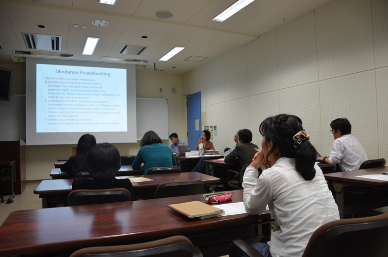 HiPeC研究員の香川めぐみが、自身のフィールド調査の成果をもとに、ミンダナオ独自の社会環境に配慮した「ハイブリッド型紛争解決メカニズム」について発表を行った。フィリピン政府とモロ・イスラム解放戦線(MILF)がちょうど数日前にバンサモロをめぐる協定に署名したこともあり、非常にタイムリーな研究発表となった。