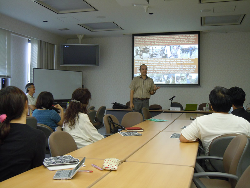 バグダッド大学の講師で、現在IDECに客員として滞在しているアブドゥル・ハイデル氏を迎え、2003年にアメリカの介入のもとでサダム・フセインの時代に終止符を打ち、民主化推進による和平プロセスの移行期を経験しているイラク社会の現状を分析する研究会が行われた。まず、1958年の共和制以前の状況とそれ以降の違いが政治・宗教・社会の仕組み全般にわたって詳細に説明された。次に、1981年以降のサダム・フセイン時代について、イランとの国境地域に住む人々を中心とした抵抗運動を焦点に解説がなされた。最後に、今後のイラクの平和構築に関して、十分な社会インフラの整備を通じたサポート体制のもとで、包括的な合意の枠組みを多様な他者を取り込みながら建設的方向へ向けていくことで、中東地域の多国間の安定にも寄与しうる平和が実現可能になることが強調された。