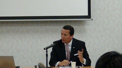 At this seminar that hung up "peace building and national reconstruction, and international assistance" over the title, the first guest speaker, Mr. Alexander MEJIA(UNITAR Hiroshima office head) presented his very impressive material to us.